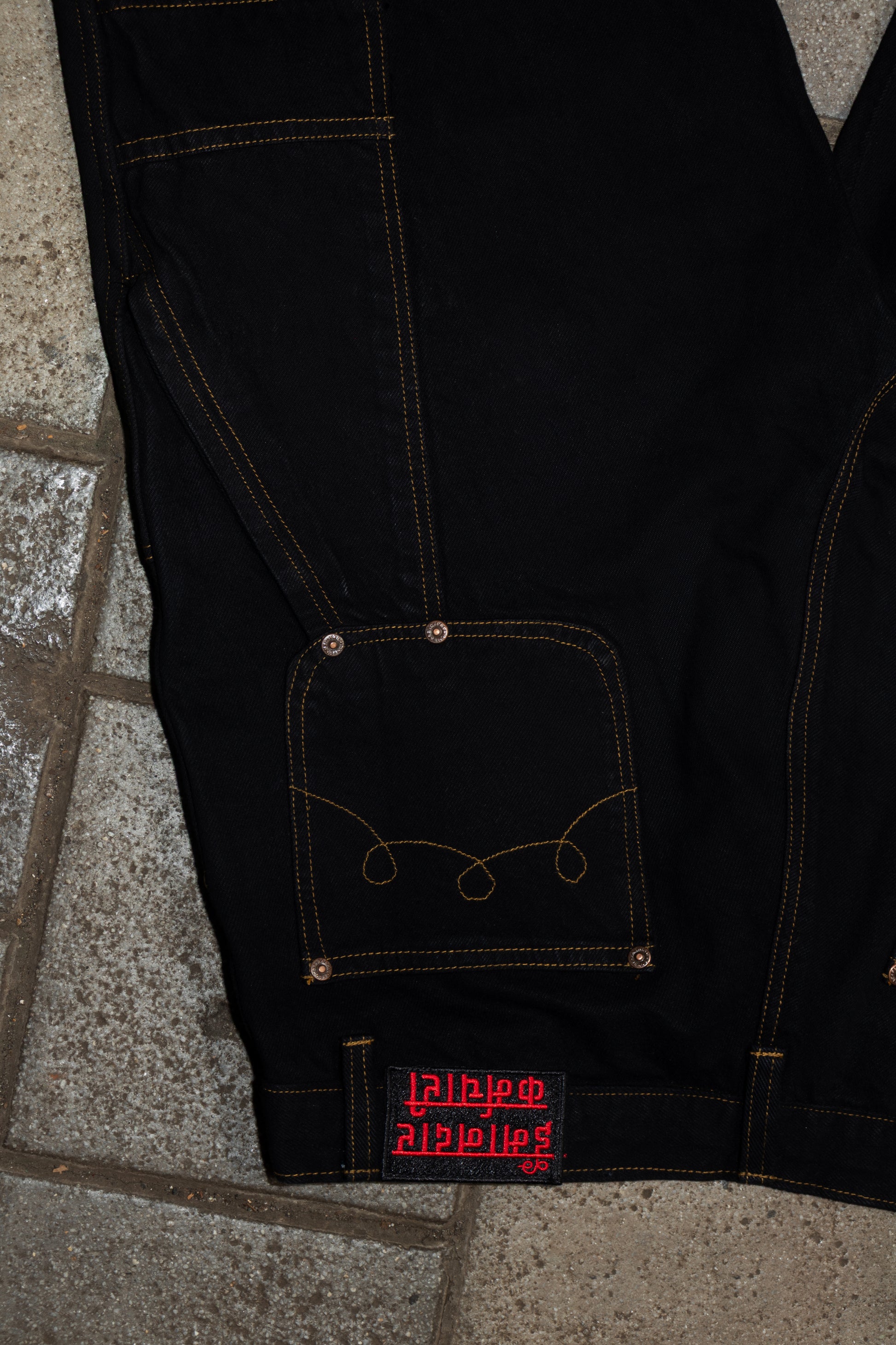 Black with signature golden thread, double-kneed for durability, and rivet-reinforced where life hits hardest. With 2 front, 2 back (signature stitch), and 2 bullet pockets — you’re not carrying things, you’re carrying your hustle.
